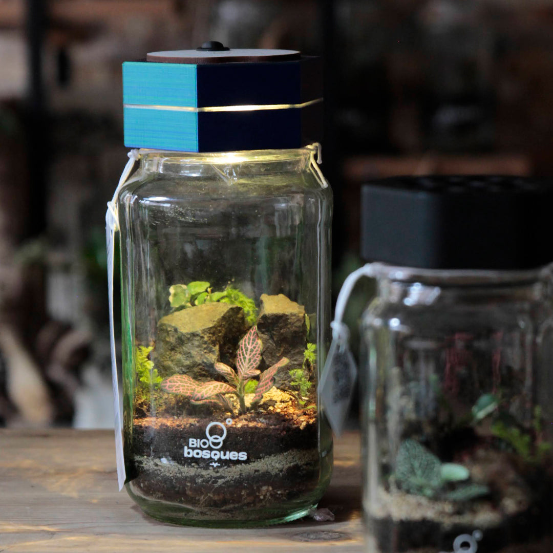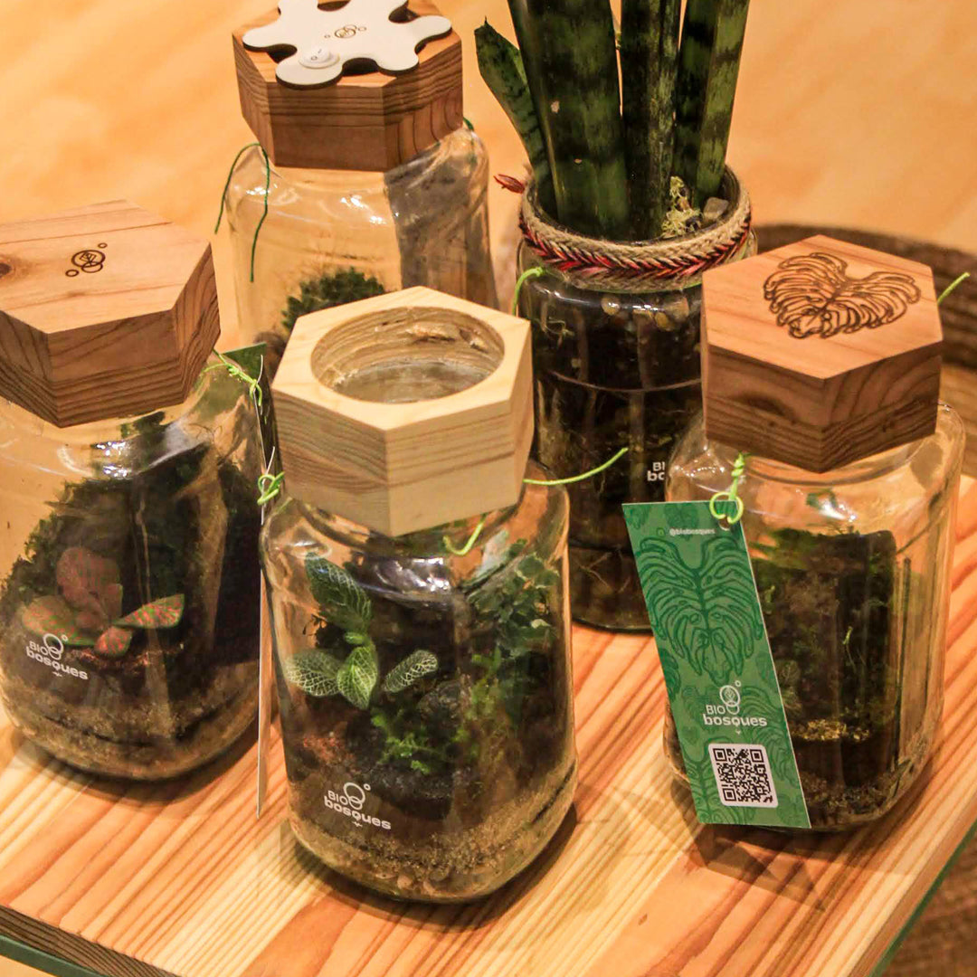 Ecosistemas - terrarios en recipiente de vidrio, la mayoría reciclado por nuestra esencia de economía circular. Tapas de materiales sostenibles.