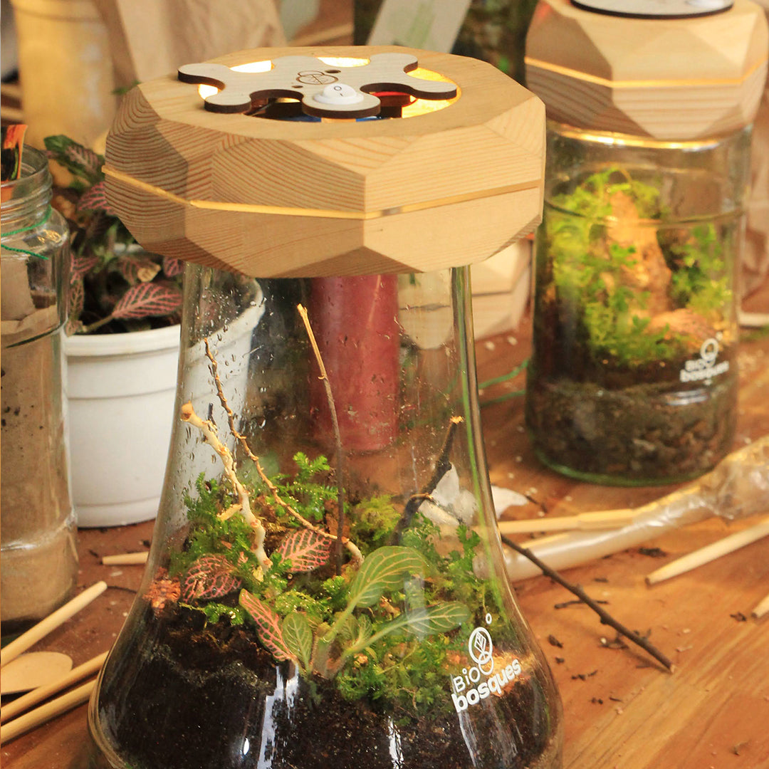 Bosque XL (grande) con tapa en impresión 3D o en madera (sujeto a disponibilidad). Ecosistemas - terrarios en recipiente de vidrio, la mayoría reciclado por nuestra esencia de economía circular.