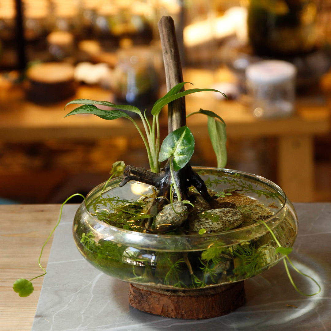 Ecosistema acuático en recipiente de vidrio, la mayoría reciclado por nuestra esencia de economía circular, tapas de materiales sostenibles.